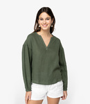 100% linen. Comfort fit. Dropped shoulders. V shaped buttonless placket. Gathered at armholes and cuffs. Recycled plastic single button cuff. Straight hem. Tag free. Garment washed after assembly, colours may vary slightly. Special Order items are non-stock Items ordered from the supplier. These items are non-returnable, and lead times may vary.